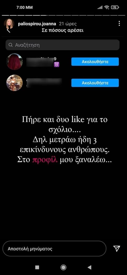 Κάνοντας μια ανάρτηση στο instagram έγραψε. Τι αποκάλυψε η Ιωάννα Παλιοσπύρου για την δράστρια. O agnostos kavgas to katevasmeno profil kai i ypopti tsanta.